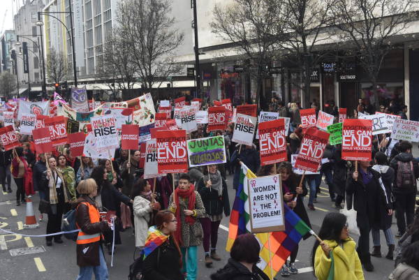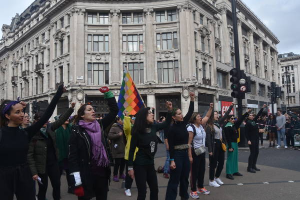 Bond Street üzerinde toplanan kadınlar kortej halinde Londra’nın en işlek caddesi Oxfort Street üzerinden Trafalgar Meydanı’na doğru yürüyüşe geçti. Kadınların danslar eşliğinde şarkılar söylediği eylemde, Şili’de feministlerin başlattığı ve kadına yönelik şiddete karşı tüm dünyaya yayılan Las Tesis dans performansı sergilendi. Gösterim sırasında kadınların polislere dönerek söylediği, “Tecavüzcü sendin, tecavüzcü sensin. Polis, hakimler, devlet başkanı, baskıcı devlet bir erkek tecavüzcüdür. Baskıcı devlet bir erkek tecavüzcüdür” şeklindeki şarkı sözleri dikkat çekti.