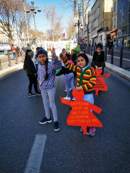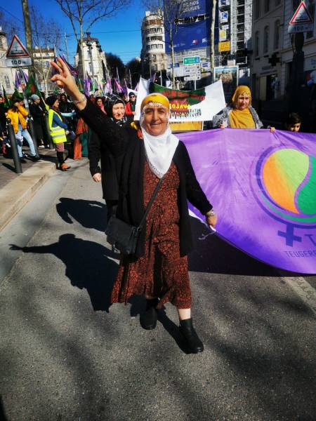 Yürüyüş'te Rojava'ya dikkat çeken pankart açılırken, Paris’te katledilen Sakine Cansız, Leyla Şaylemez ile Fidan Doğan'ın posterleri taşındı. Fransızca ve Kürtçe "Jin Jiyan Azadi" sloganlarının atıldığı etkinlikte Fransızca bildiriler okundu. Arin Mirkan kadın meclisi adına konuşmaların yapıldığı eylem halaylarla sona erdi. Kadınlar daha sonra Vieux Port meydanında stant açtı.