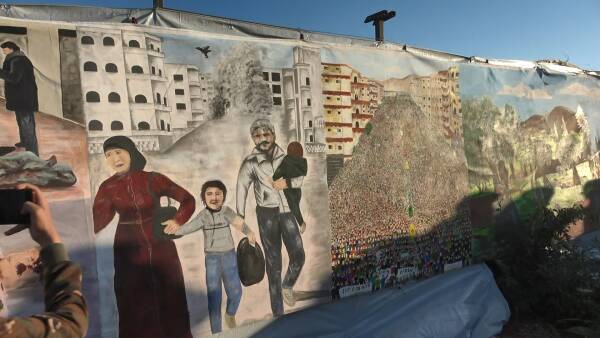 Türk devletinin işgal saldırılarına 58 gün boyunca mücadele eden Efrîn halkının bu direnişte çok acı hikayeleri var. Toplumsal İşler ve Çalışma Komitesi, komün bir şekilde yaptıkları 58 metrelik tablo ile Türk devletinin işgalinden sonra topraklarından göç etmek zorunda kalan Efrînlilerin yaşadığı zorlukları ve acıları anlatıyor.