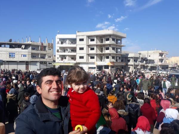 Kobanê'de Efrîn işgalinin yıl dönümünü protesto etmek için toplanan binler, Şehit Egid meydanına yürüyor.