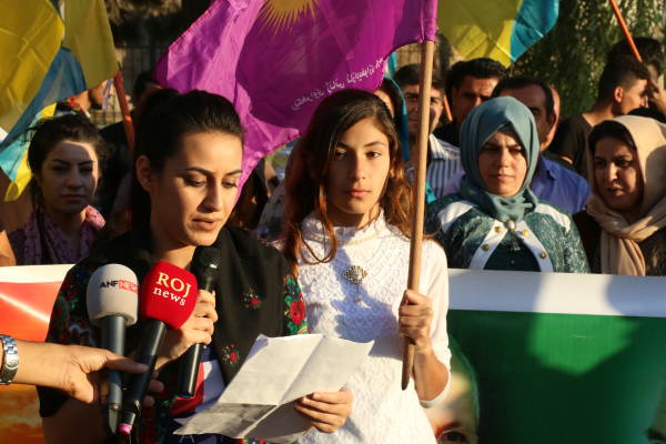 Kürdistan Özgür Toplum Hareketi, Kürdistan Özgür Kadın Hareketi ve Kürdistan Özgür Gençlik hareketi tarafından organize edilen protesto yürüyüşünde ilk konuşmayı Kürdistan Özgür Kadın Hareketi Temsilcisi Soma Ferhad yaptı. Ferhad, şunları söyledi: