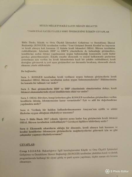 Bitlis’te KOSGEB Şube Müdürlüğü'ne hibe başvurusunda bulunan Esnaf Hamza Özkan’a, "Kurul Karar Bildirim Yazımızda ‘Resmi makamlardan güvenlik sorgulaması yapıldıktan sonra işlem tahsis edilecektir’ ibaresi ile tarafınıza bilgi verilmiştir. OHAL kapsamında alınan tedbirlere ilişkin KHK ve karar sayıları KHK/667 ve madde 2’ye göre yapılmıştır. ‘Sakıncalı’ durumlar tespit edildiğinden T.C Bitlis Valiliği ve Bitlis Müdürlüğü olarak projenizin desteklenmesine dair herhangi bir işlem tesis edilmeyecektir” Yanıtı verildi.