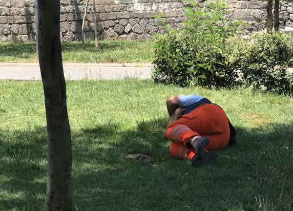 Amed'de şehir merkezinde sıcaklık hissedilir derecede artınca halk serinlemek için çare arıyor. Amed halkı hava sıcaklığı nedeniyle surları, parkları ve yeşil alanları doldurdu. Sur dipleri, Orman Park, Rihan Park ve Sümerpark gibi yerlerde ağaç gölgesinde uyuyan Amedliler dikkati çekiyor.