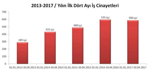 Meclis, “Zaten kötü olan çalışma koşulları daha da kötüleşti. OHAL ilanı ile beraber iş cinayetleri 2016 yılında yüzde 9 artış gösterdi” diye rapor etti. İş Sağlığı ve İş Güvenliği Meclisi’nin 2017 yılının ilk dört ayına ilişkin raporu da tüyler ürpertici. Rapora göre sadece Nisan ayında en az 145, yılın ilk dört ayında ise en az 586 işçi yaşamını yitirdi. Önceki yılların aynı dönemleri ile kıyaslandığında iş cinayetlerinde büyük artış yaşandığı gözlemleniyor. 2013 yılının ilk dört ayında 289 işçi hayatını kaybederken, bu ölümler sonraki yıllarda sürekli artış kaydetti. 2015’in ilk dört ayında 488’e, 2016’da 595’e çıktı.