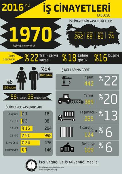 Bölgenin diğer bir ülkesi olan Türkiye’de de iş güvenliği ve sağlığı hiç olmadığı kadar geriledi. Sivil toplum örgütü İş Sağlığı ve İş Güvenliği Meclisi’ne göre 2016 yılında en az 1970 işçi yaşamını yitirdi. Hayatını kaybedenlerin 1682’si işçi ve memur, 288’i ise çiftçi ve esnaflardan oluşuyor. OHAL uygulamalar ile birlikte iş cinayetleri arttı.